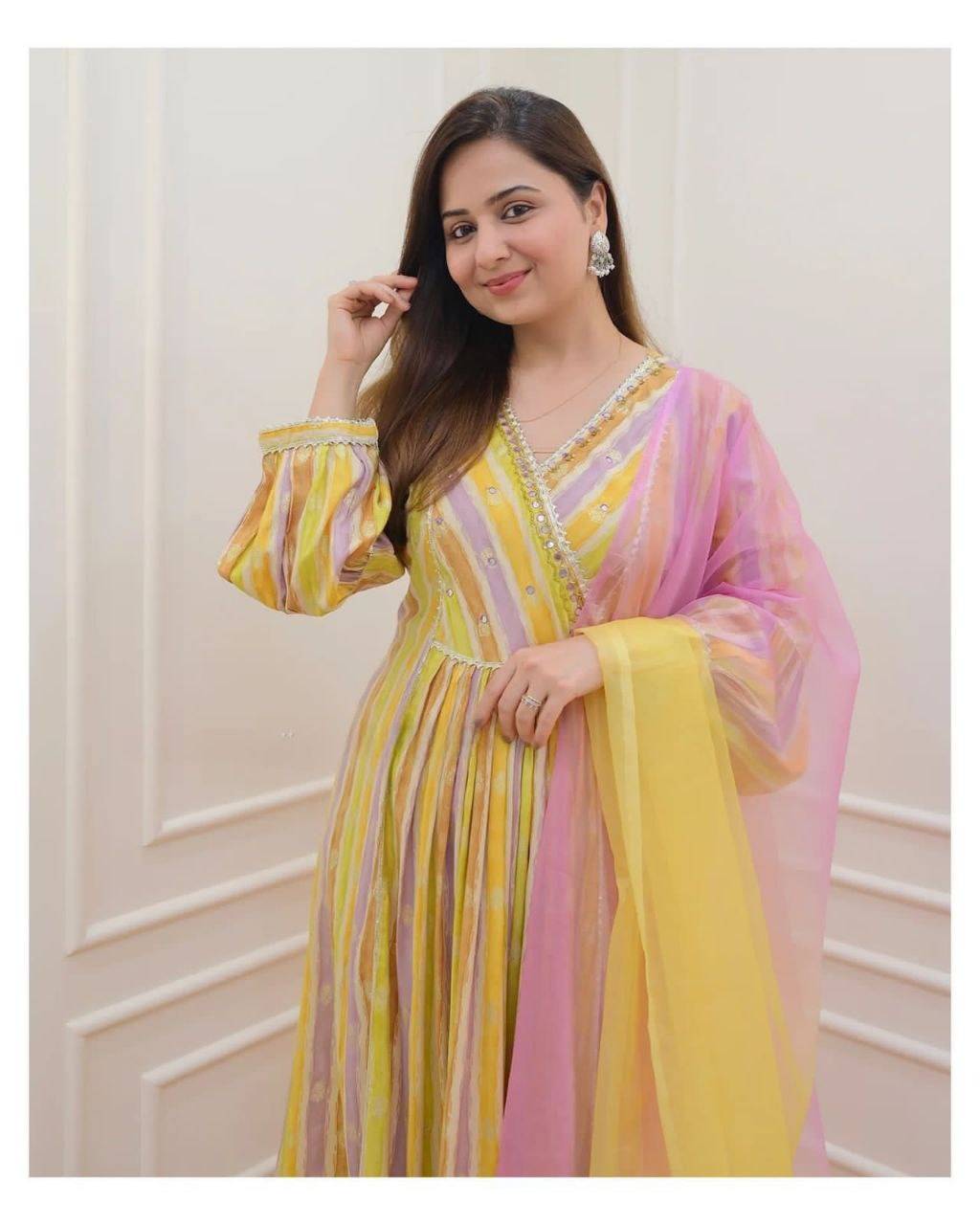 elegant printing Anarkali gown with Color. Maltiprint and pettern. It is a perfect outfit for any small gathering or function. It is very comfortable as it